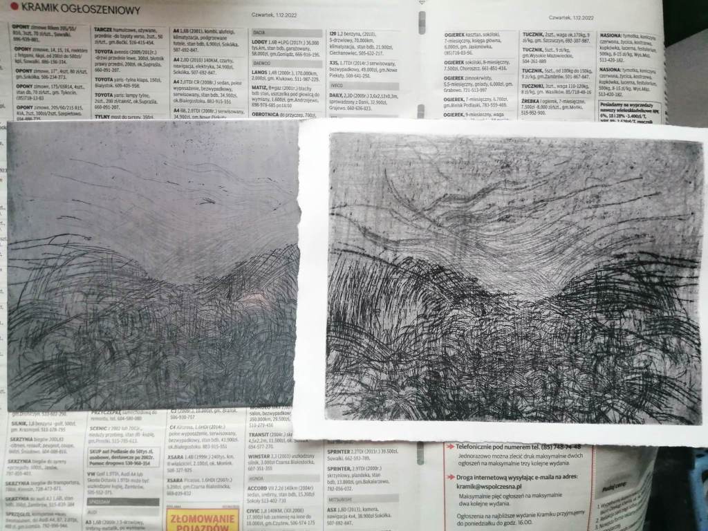 Podsumowując, uważam to za naprawdę dobry wynik. Należy tylko na przyszłość użyć kalki technicznej. Większych marginesów. Duże delikatne płaszczyzny wymagają bardziej metodycznego i konsekwentnego odbijania, raz przy razie. Grafika prezentuje się dobrze. Pozostaje tylko dalej robić trawienia i odbijać cały cykl. Muszę zobaczyć jak prasa poradzi sobie z naprawdę mocno wytrawioną Tintą. Skoro jednak odbiła tak delikatne trawienia, myślę, że nie będzie żadnych problemów. Na przyszłość zapraszam na Tutoriale, dotyczące trawienia. A na deser ręczne odbijanie wielkich formatów, ale to za jakiś czas.