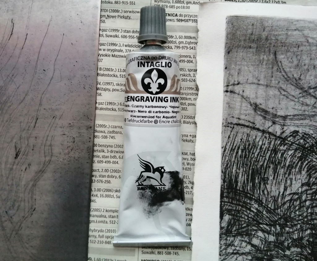 W tym odbijaniu użyłem farby Renesans do intaglio, średnia czerń, dosyć ładnie wychodzi w niej delikatna tinta. Ważna jest odpowiednia konsystencja, nieważne czy użyjemy dedykowanej farby Charbonell, czy Renesans. Jeżeli po otwarciu okaże się, że olej cieknie hektolitrami, jakby oddzielił się, nie zrobimy dobrej odbitki. Oczywiście odbijam małą praską Slama Press oraz użyłem papieru Fabriano Rozaspina. Może to trochę wyglądać, jak reklama jednak tak nie jest. Używanie byle jakiej farby rozrobionej ze smalcem i mąką, oraz zwykłego brystolu, spowoduje, że papier bardzo szybko-już po paru latach-straci biel. Mogą pojawić się problemy z tonami, kontrastem linii. Dlatego zawsze używa się do odbitek papierów czerpanych, najlepiej bezdrzewnikowych, bawełnianych, bezkwasowych. Mają dłuższą żywotność, odpowiednią gramaturę. Do Akwaforty z Akwatintą papier musi być mięsisty gruby i miękki. Dostępna jest cała gama odpowiednich firm, które produkują papier wysokiej jakości – Fabriano, Hahnemuhle, Canson, Zerkall i inne.