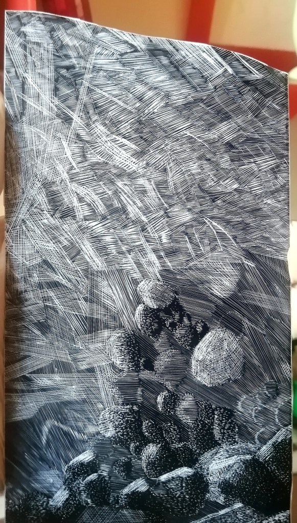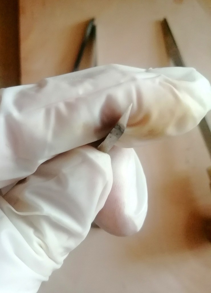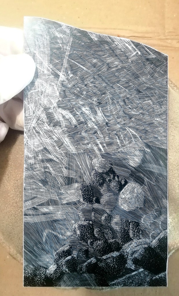Jest to jedna z matryc z poprzedniego wpisu. Grafika, cykl za jednym zamachem – Burin and Wood % (graphic-thunder.com). W tym stanie matrycy, uzyskamy odbitkę z małą ilością kontrastów zdominowaną przez szarość, dlatego należy użyć rylca nazywanego spitstiker, (aby wydobyć światło), w naszym języku będzie to najprawdopodobniej rylec eliptyczny. Narzędzie to ma taką cechę, że oddaje docisk ręki, wycinając dowolne linie o dowolnym napięciu i natężeniu, również krzywe.