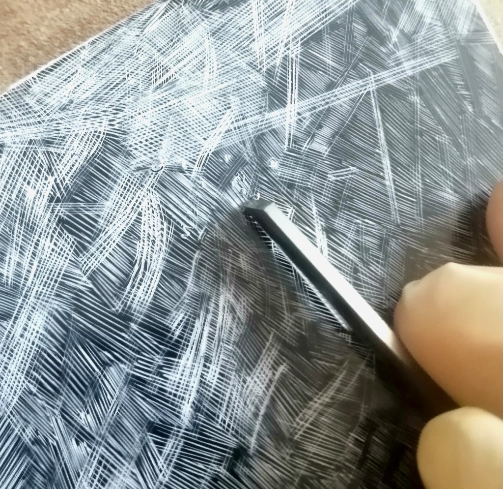 Tint tool, czyli właściwie rylec nożowy. Wycinamy nim supercienkie delikatnie linie jednakowej grubości. Najczęściej opracowuje się nim chmury i niebo. Pozwala uzyskiwać delikatne szarości.