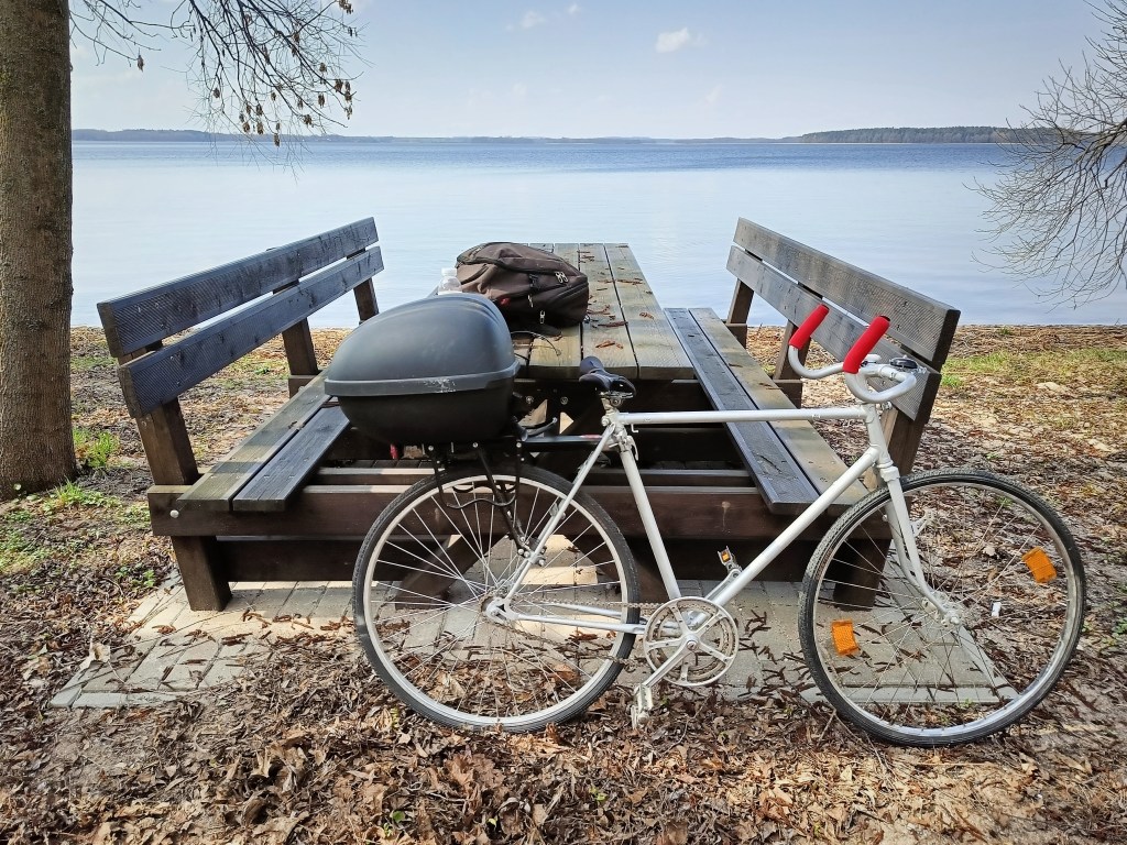 Zacząłem od porządnego śniadania. Postanowiłem pojechać rowerem to malownicza trasa. Na jednodniowy wypad. Niestety około dziewięciu kilometrów trasy przypada na ruchliwą drogę powiatową. Tiry i klucze samochodów. Następnym razem wyruszę pieszo. Nad docelowe jezioro można dojechać komunikacją miejską.
