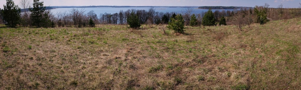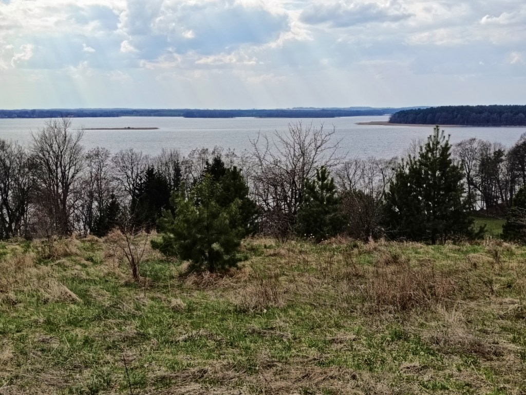 Pojechałem wzdłuż jeziora. Na legendarny drewniany mostek na Łaźnej strudze. Po drodze zauważyłem spore wzgórze dotykające drogi i górujące nad całym jeziorem.