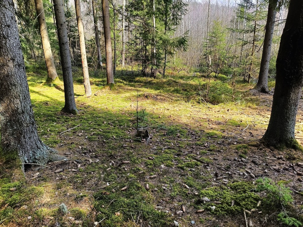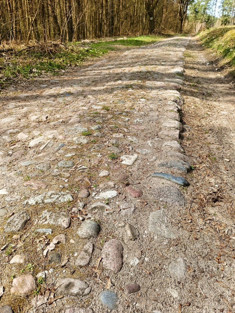 Wjechałem w las i skręciłem we właściwą drogę. Zaskoczyło mnie, że na pierwszym odcinku zwykłej leśnej drogi pozostał fragment starych kocich łbów. Nie powiem jak starych, zagadka. Może z XIX wieku, może starsze.