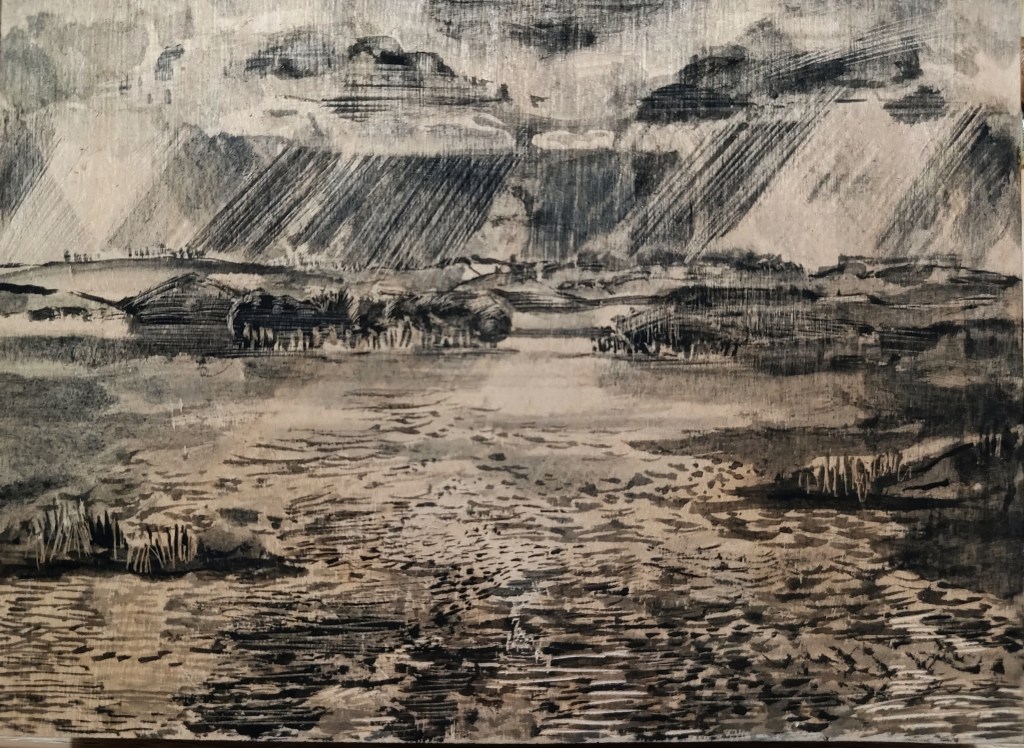 Grafika w początkowej fazie. Tylko zaznaczamy to, co najważniejsze. Widać już jakąś przestrzeń. Potrzeba jednak uporządkować biele i zagęścić obraz. Stopniowo nasycić nie tracąc lekkości.