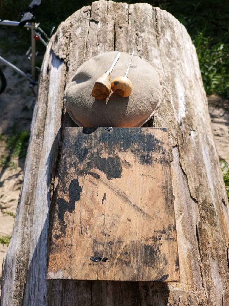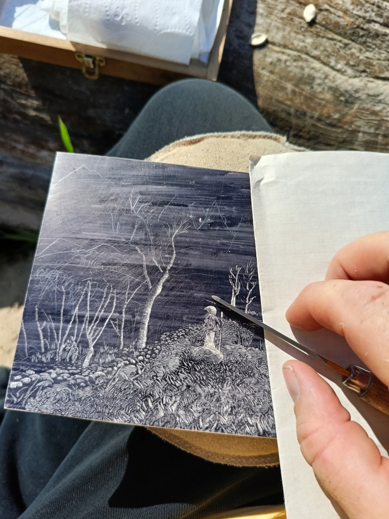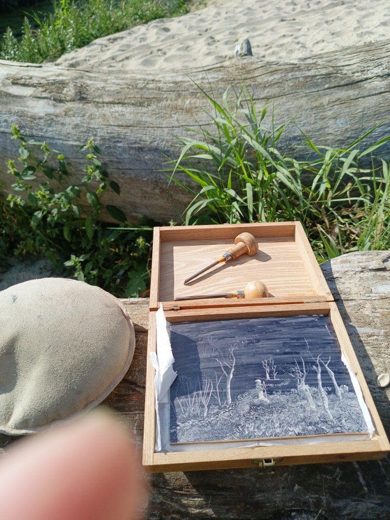 Po latach szkolnych, spędzonych zawsze gdzieś w pomieszczeniach, a czasem prawie lochach, jak hala maszyn w Warszawskim ASP. Przychodzi taki moment kiedy swoboda twórcza łączy się naturalnie z potrzebą wolności. Podróżowania, eksploracji czy zwykłego rekreacyjnego przebywania na łonie natury. Dobre opanowanie i zminimalizowanie warsztatu daje nam w przypadku drzeworytu uwolnienie od prasy czy wymogów zorganizowanej drogiej pracowni. W moim przypadku wystarczy mała Slama Press plus podstawowy wałek, dobra farba. Niewielki format matryc pozwala zabrać je ze sobą wszędzie. Dziś pracowałem nad rzeką, szum wody, zieleń…przed zimą należy ich nałapać jak najwięcej.