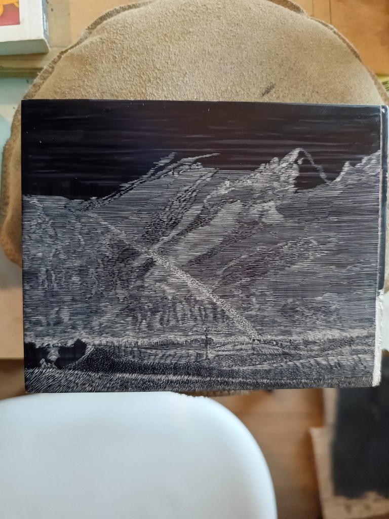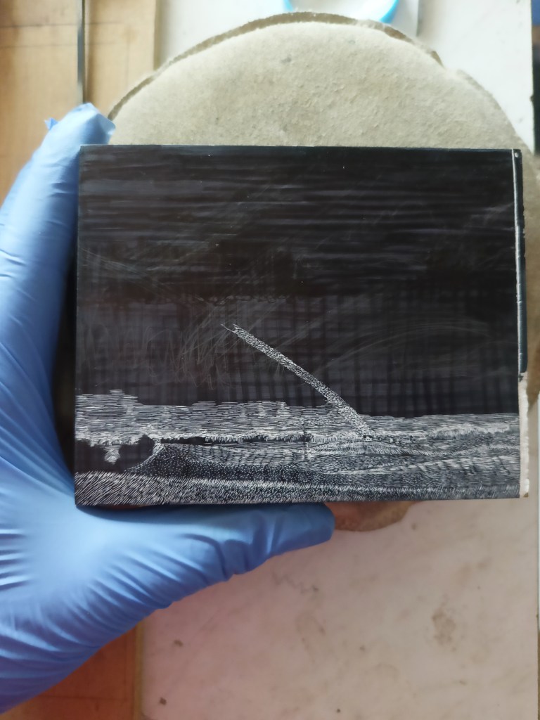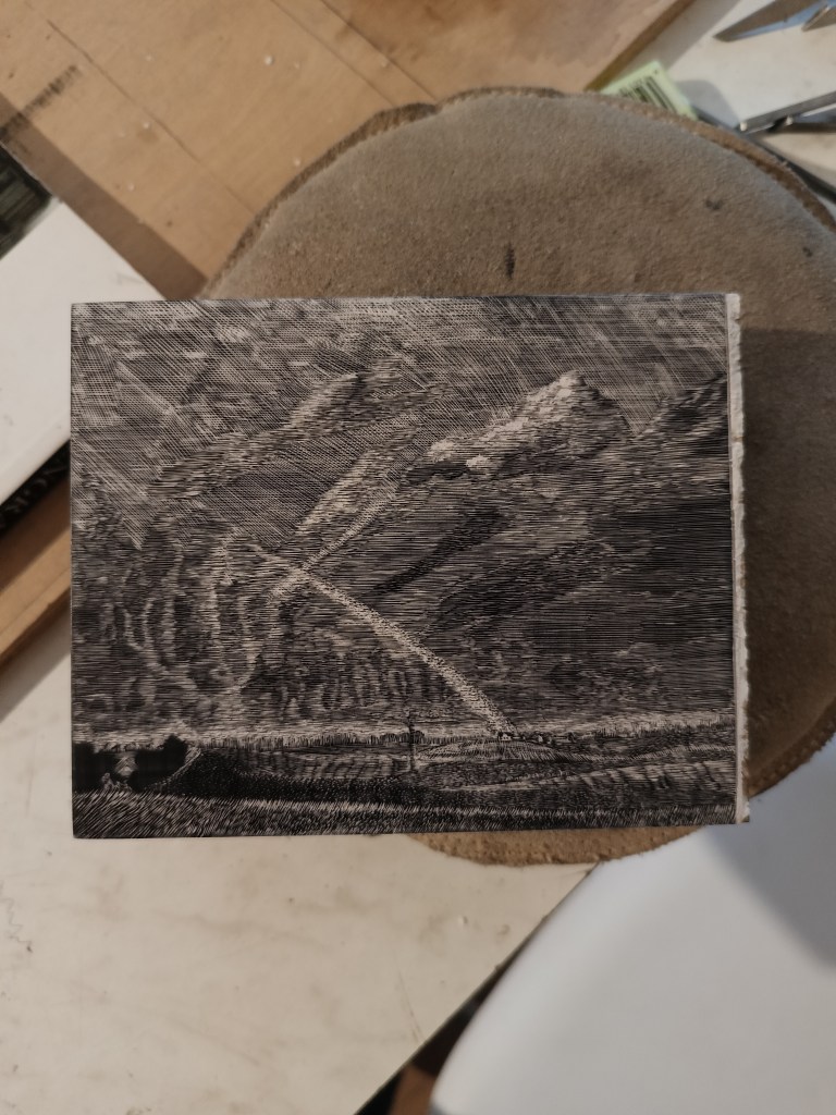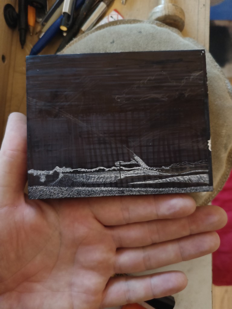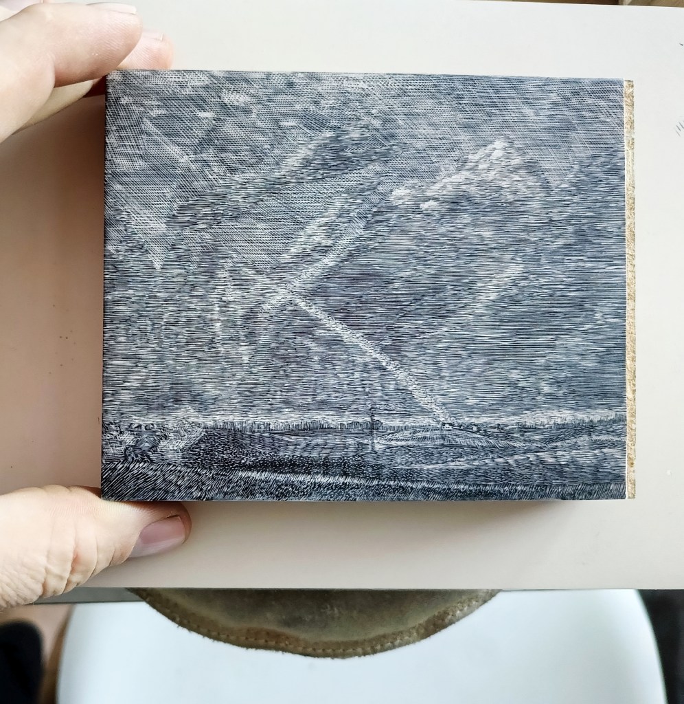 Pierwsza warstwa wycinania, kompozycja nie jest jeszcze rozwiązana, dzieje się zbyt dużo. Teraz ustawiamy miejsce z najwyższą czernią i bielą. To bardzo ważne, aby nie próbować robić tego z dużymi obszarami niedociętej matrycy. Wchodzimy wielokrotnie rylcem i wpuszczamy światło. Zatapiamy zbyt mocne szczegóły, aż niebo stanie się leciutkie a ziemia konkretna i ciężka.