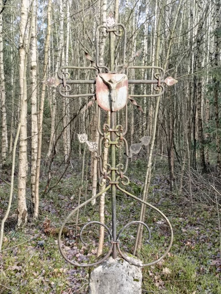 Wszystko byłoby „cacy”, piękna pogoda, dobry nastrój, jednak byłem w tym miejscu 3 razy i za każdym razem po powrocie do domu wieczorem śnił mi się jakiś naprawdę ciężki koszmar… związany z tym lasem….. Nigdy tak nie było, jeździłem w tyle miejsc, nocowałem samotnie w lesie, i nie było takich sytuacji. Po ostatnim baaardzo nieprzyjemnym śnie postanowiłem więcej tam nie przyjeżdżać, nie zaglądać, zostawić w spokoju….. I ten przydrożny krzyż z XIX wieku. Można zapewne powiedzieć, że znalazłem, to czego szukałem nawet krucyfiks z tamtych czasów.