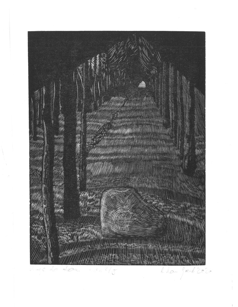 Długa droga do domu, tak……to była podróż, aby odkryć świat grafiki i zacząć nim żyć. Szczególnie drzeworytem sztorcowym. Obrazek, który widzicie, jest jednym z pierwszych drzeworytów, które wykonałem i właściwie jest o odległym celu i masie przeszkód stojących na naszej drodze, chcielibyśmy je usunąć, jednak każdy głaz i każdy cień niesie w sobie bezcenną wiedzę i lekcję.